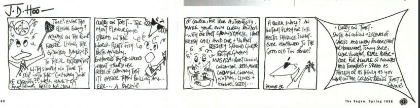 So it was interesting to stumble upon this old JD Hoo cartoon from The Vegan. I can’t quite remember how long she appeared there - quarterly for perhaps five or so years. What I do remember is a new editor (replacing Richard Farhall who had originally commissioned them) writing to me (sometime in the late 90s) saying ‘I think these are meant to be funny, but I don’t find them so’. And that was the end of JDHoo’s relationship with The Vegan magazine. And JDHoo in the public realm.