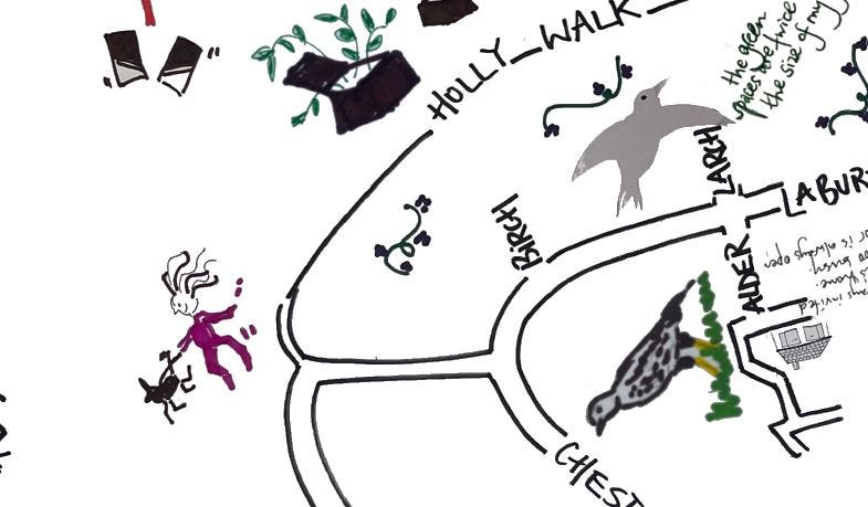 Until I work with Closing Loops on Mapping Our Place, a community participatory project I’ve been trying to get off the ground (seeded in the Walk with Us, NOC collaboration with Maya Chowdhry) for some years, and am now in the final stages of. And see how her spirit is still very much alive in my interpretations of people’s stories on the maps.